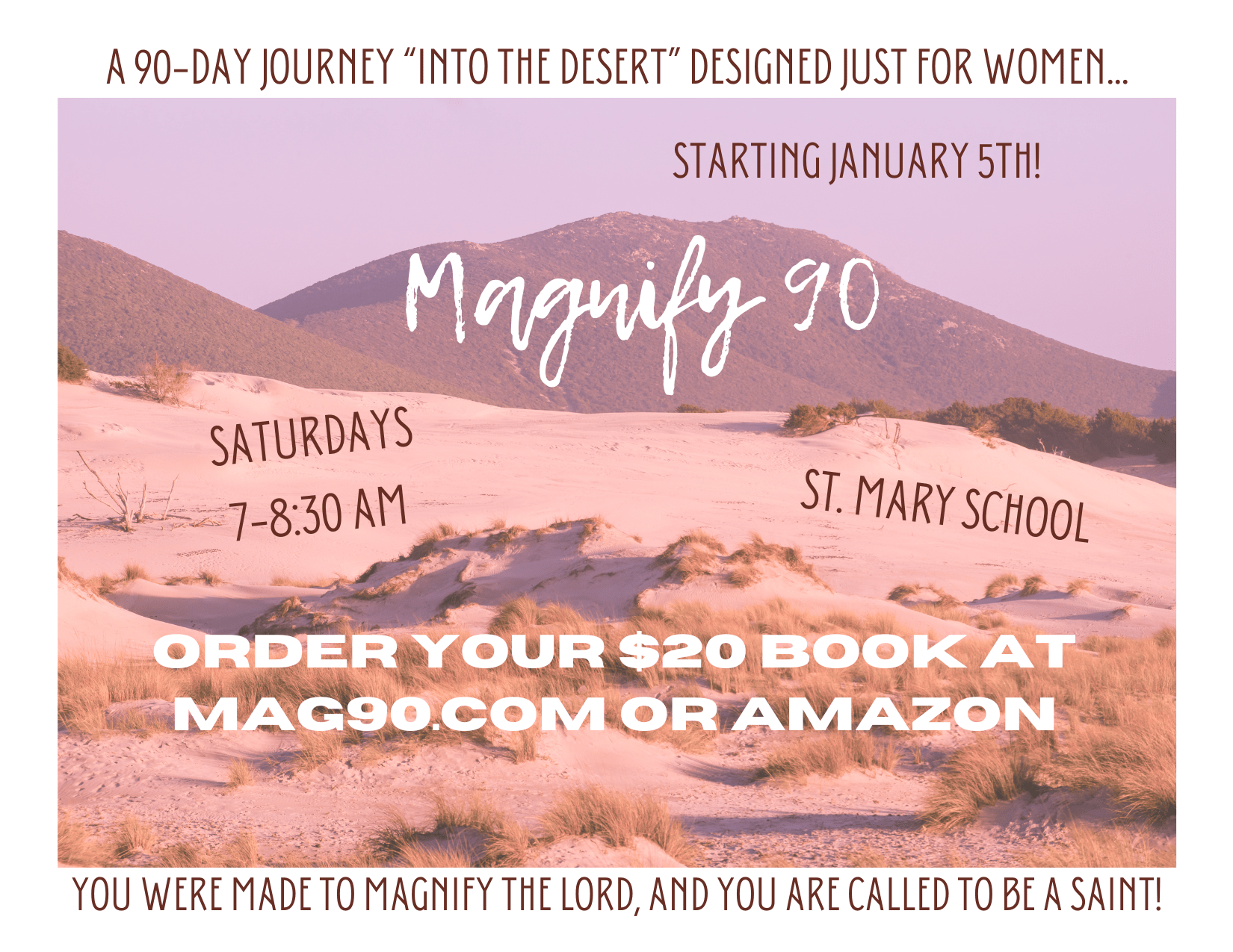 St. Mary 2640 Stoney Ridge Road, Avon, United StatesThis 90-day challenge began January 10, but join a community of women on Saturday mornings to cultivate virtue through scripture, reflection, and asceticism to let our interior lives magnify the Lord. Order your $20 book at mag90.com or on Amazon! No RSVP necessary, just come with the book!